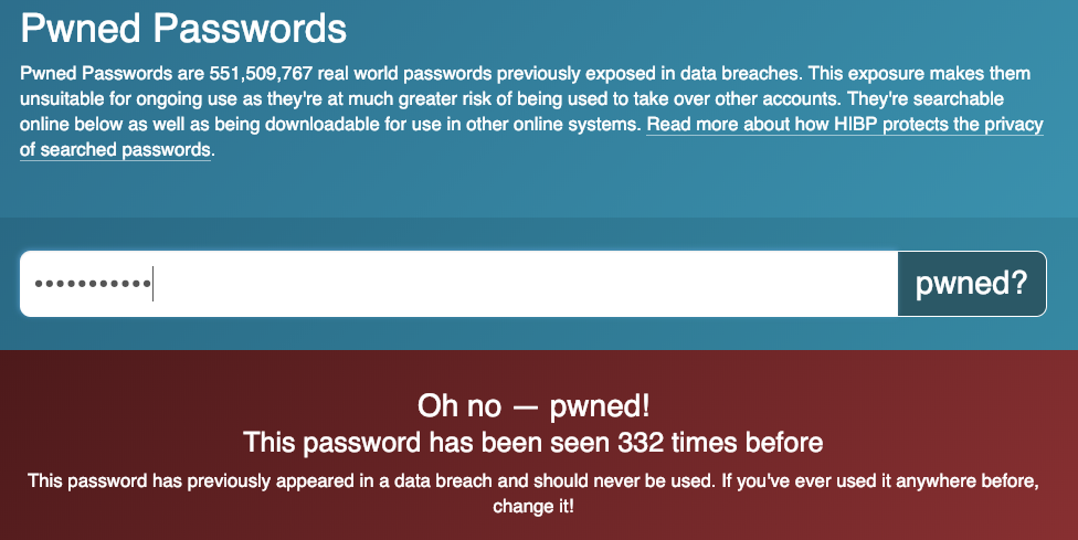 If you are worried about entering your password on a random site, HIBP is essentially just a search feature. According to its privacy page, “the password is hashed client-side with the SHA-1 algorithm then only the first 5 characters of the hash are sent to HIBP per the Cloudflare k-anonymity implementation. HIBP never receives the original password nor enough information to discover what the original password was.”